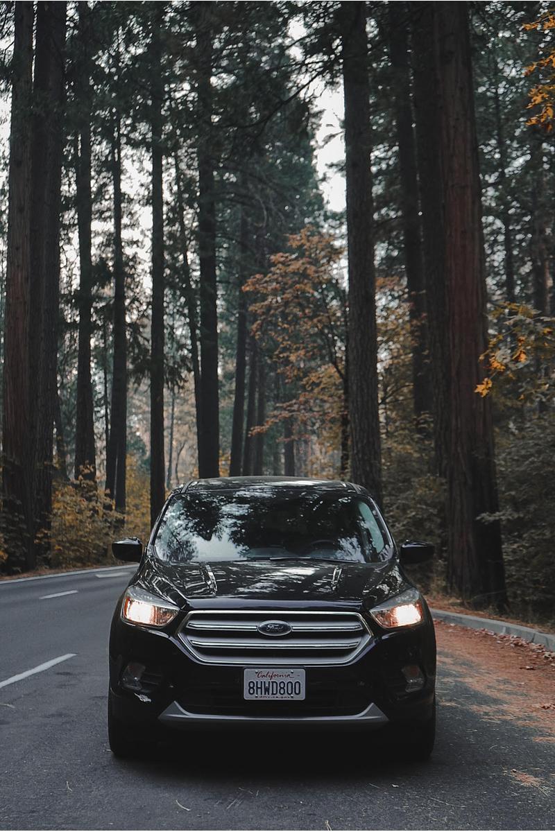 A Ford SUV, parked on the side of the road in Redwoods, NP.